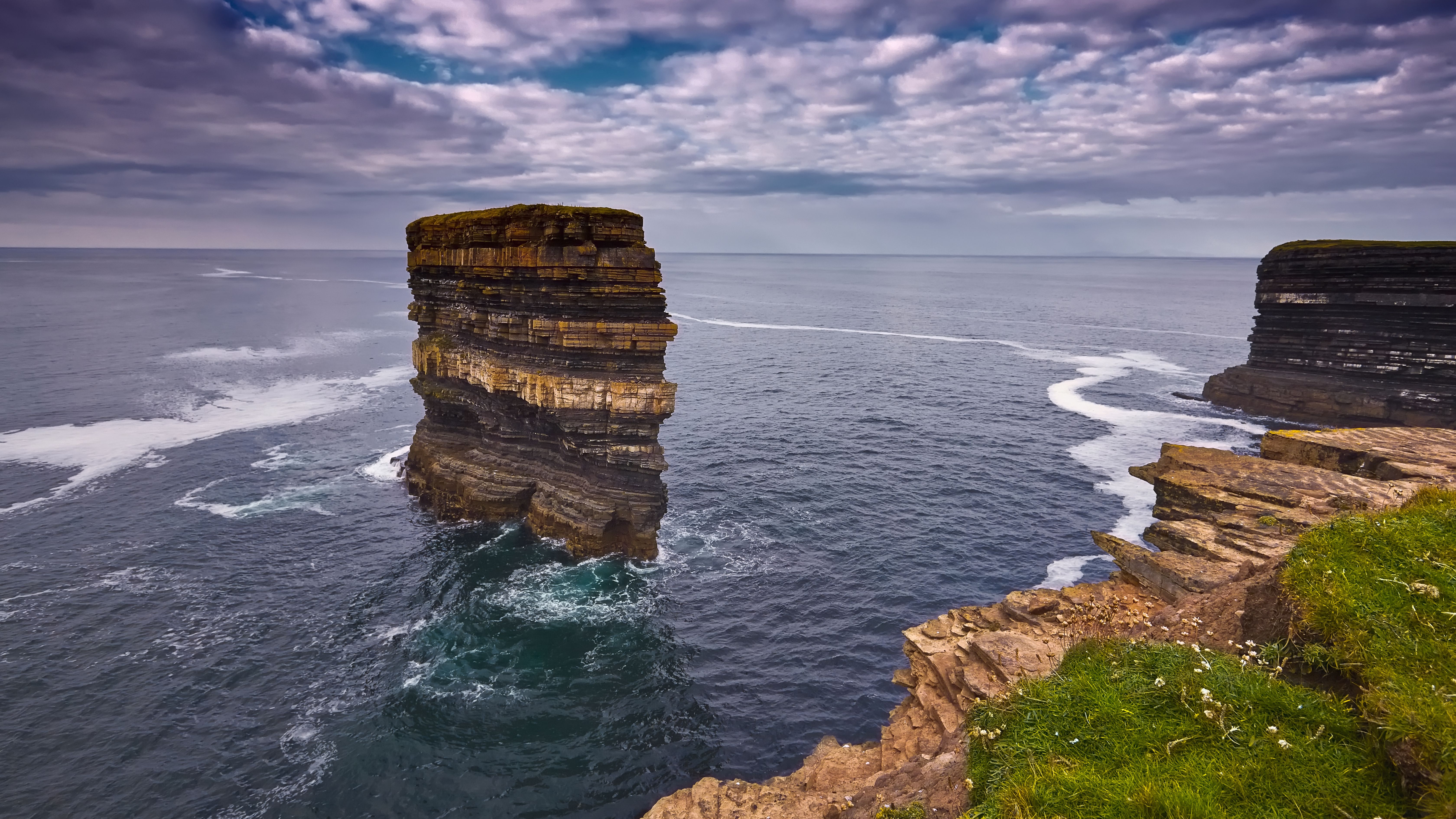 - Blowhole: Downpatrick Head beherbergt eine Reihe von Blowholes, bei denen das Meer Wasser durch Risse in den Felsen drückt und beeindruckende Gischt erzeugt. Das größte dieser Löcher ist Poll na Seantainne, das bei rauer See besonders dramatisch wirkt.