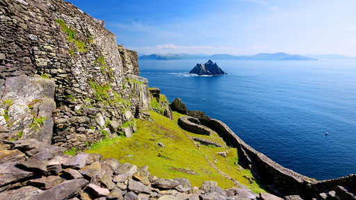 Skellig Michael ist eine historische Stätte an der Westküste Irlands. Die Stätte beherbergt eine Klostersiedlung aus dem 6. Jahrhundert und bietet atemberaubende Ausblicke auf den Atlantik und die umliegende Landschaft.